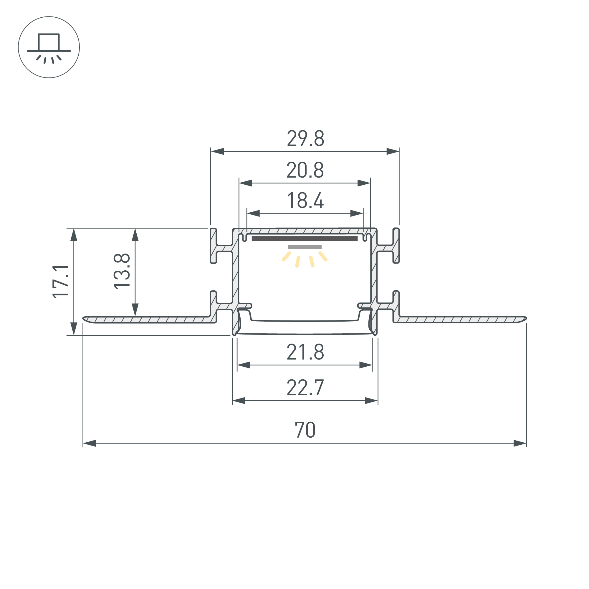 Габаритные размеры профиля составляют 2000 мм в длину, 70 мм в ширину и 17,1 мм в высоту. Площадка для установки светодиодных лент позволяет использовать ленту шириной до 17 мм и мощностью до 23 Вт/м. Рекомендуется использовать с гибкой светодиодной лентой серии RZ.