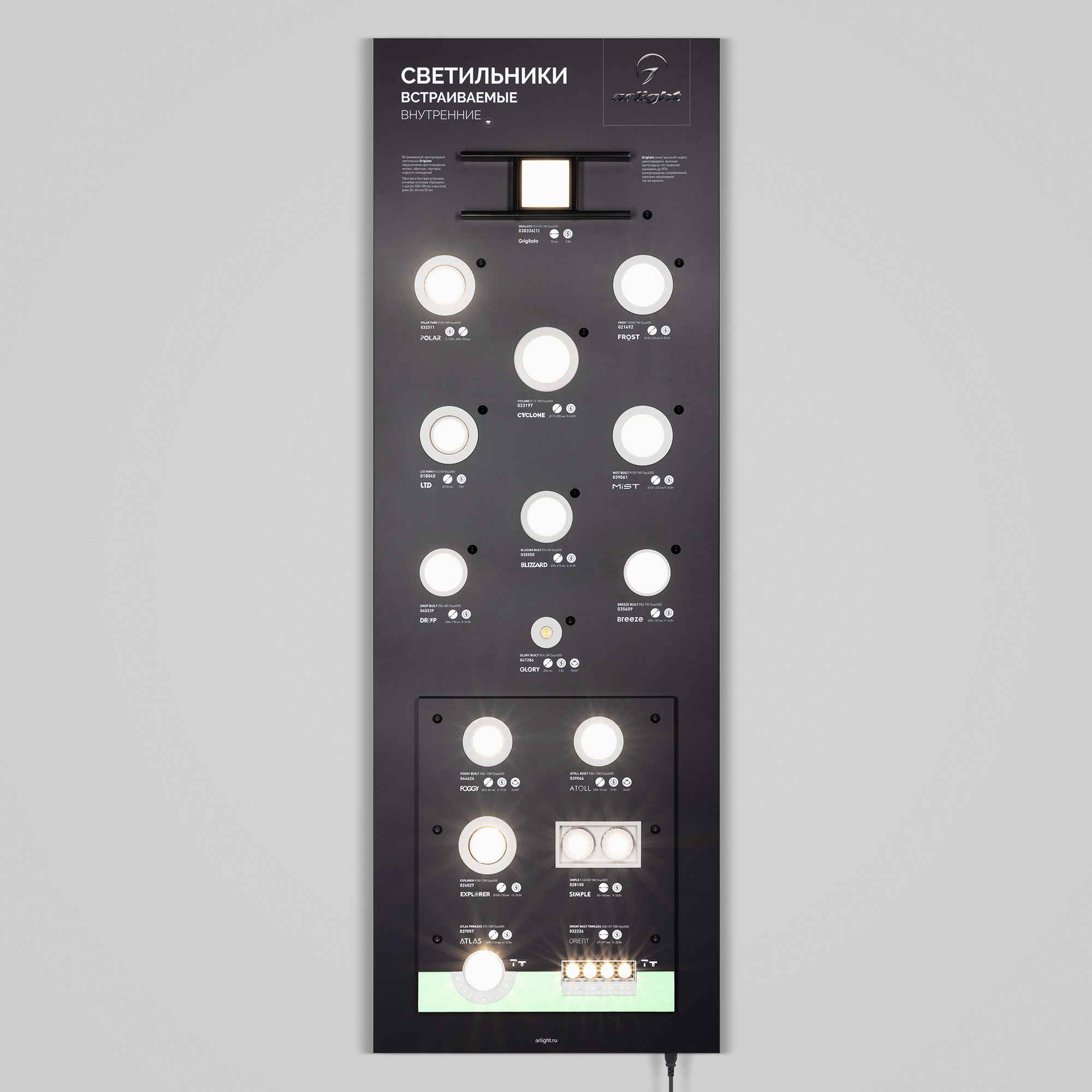 На стенде представлены самые ходовые модели даунлайтов серий FROST, CYCLONE, BREEZE, POLAR, DROP, LTD, BLIZZARD, MIST, EXPLORER, SIMPLE, ATLAS TRIMLESS, ORIENT BUILT TRIMLESS, GRIGLIATO, GLORY, FOGGY, ATOLL.