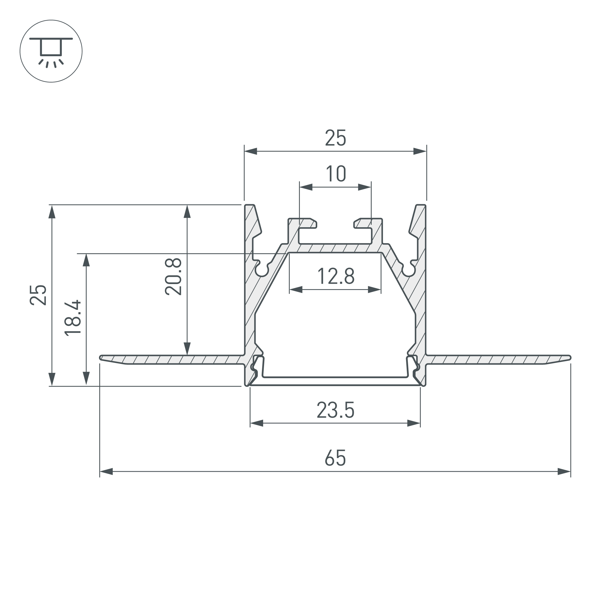 Встраиваемый профиль со скрытым фланцем под строительную отделку из анодированного алюминия серебристого цвета для основной и контурной подсветки помещений. Габаритные размеры профиля составляют 2000 мм в длину, 65 мм в ширину и 25 мм в высоту. Паз для установки 25 мм. Площадка для установки светодиодных лент позволяет использовать ленту шириной до 12,8 мм и мощностью до 36,9 Вт/м. Это обеспечивает гибкость в выборе светодиодных лент и создает потрясающие световые решения. Экраны, заглушки и другие аксессуары не включены в комплект и приобретаются отдельно. Цена указана за 1 метр профиля. Отличное решение для создания современных световых проектов.