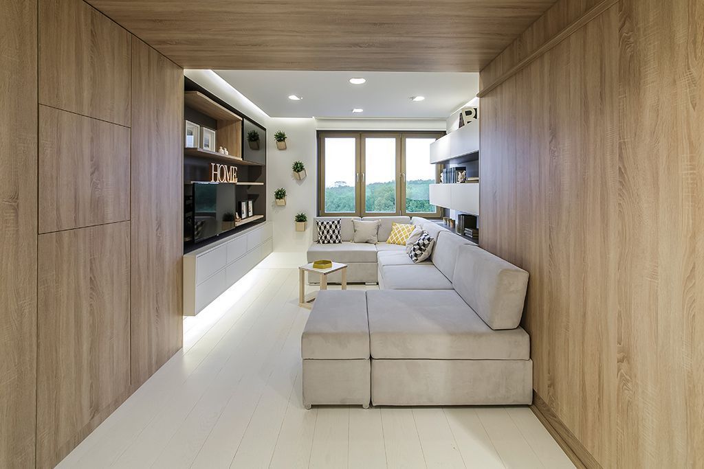 В результате комната была разделена на 3 условные зоны с помощью с помощью деревянного портала, в котором «спрятали» кровать и места хранения. Чтобы наполнить комнату светом, дизайнеры использовали белый цвет мебели, стен, пола и потолка. Особую легкость интерьеру придает светодиодная подсветка потолка и мебели.