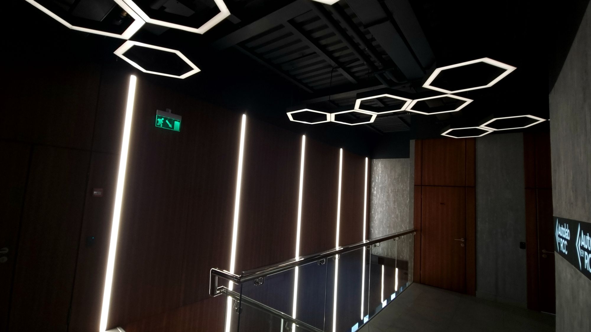 Автомобиль визуально состоит из металла, стекла и света фар — все три составляющих входят в основу лаконичного интерьера МФЦ: темно-серые и металлические оттенки стен, пола и потолка, прозрачные перегородки, зонирующие пространство, и множество световых линий, которые формируют упорядоченную геометрию.