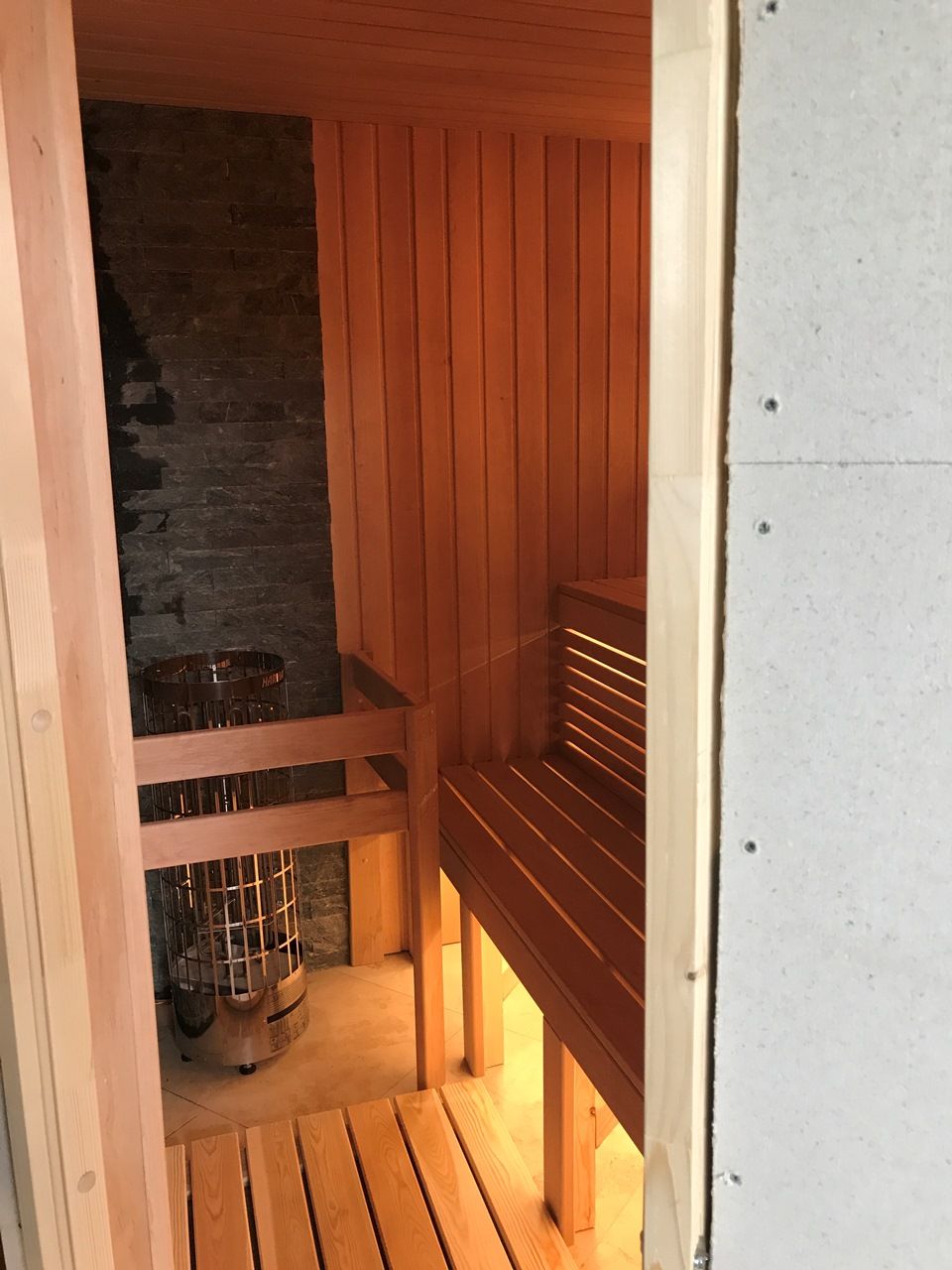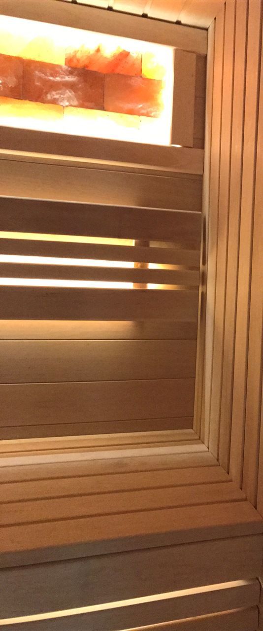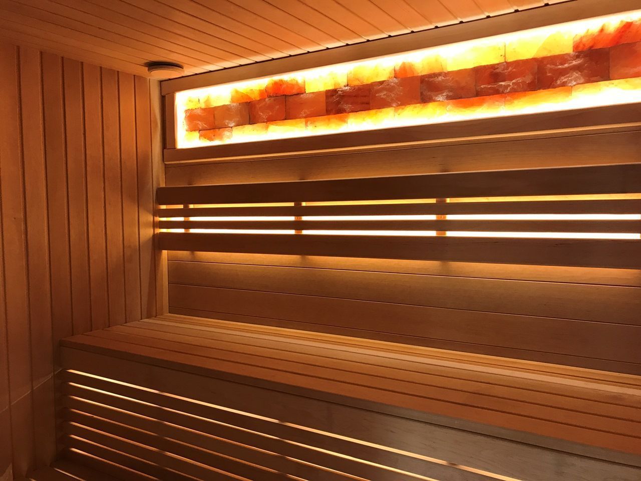 Герметичная светодиодная лента была установлена под двумя уровнями деревянных скамей сауны, их спинках, а также в декоративном витраже. Как и положено, свет в сауне получился мягким и не давящим на глаза, что придаёт ей дополнительный уют и комфорт.