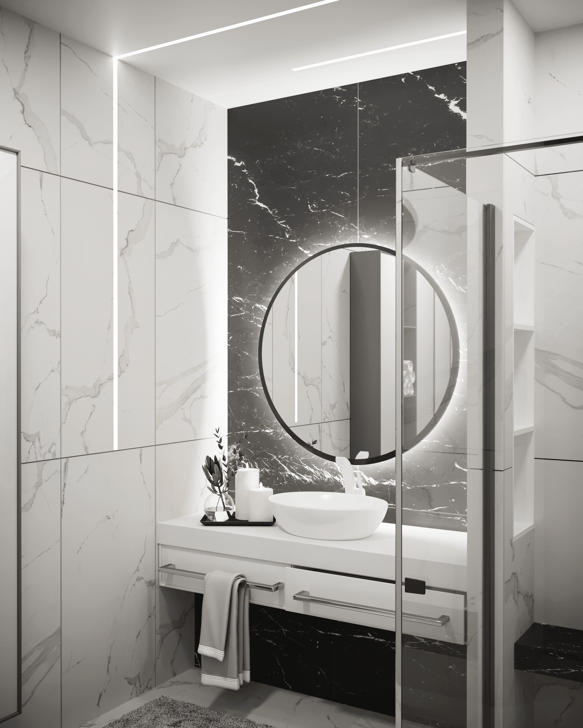 В проекте применялись анодированные профили с экраном и светодиодные ленты дневного белого свечения. Тонкие световые линии гармонично интегрированы в различные помещения. Другая часть основного освещения создана с помощью больших потолочных светильников, которые выразительно контрастируют с простыми линейными светильниками.